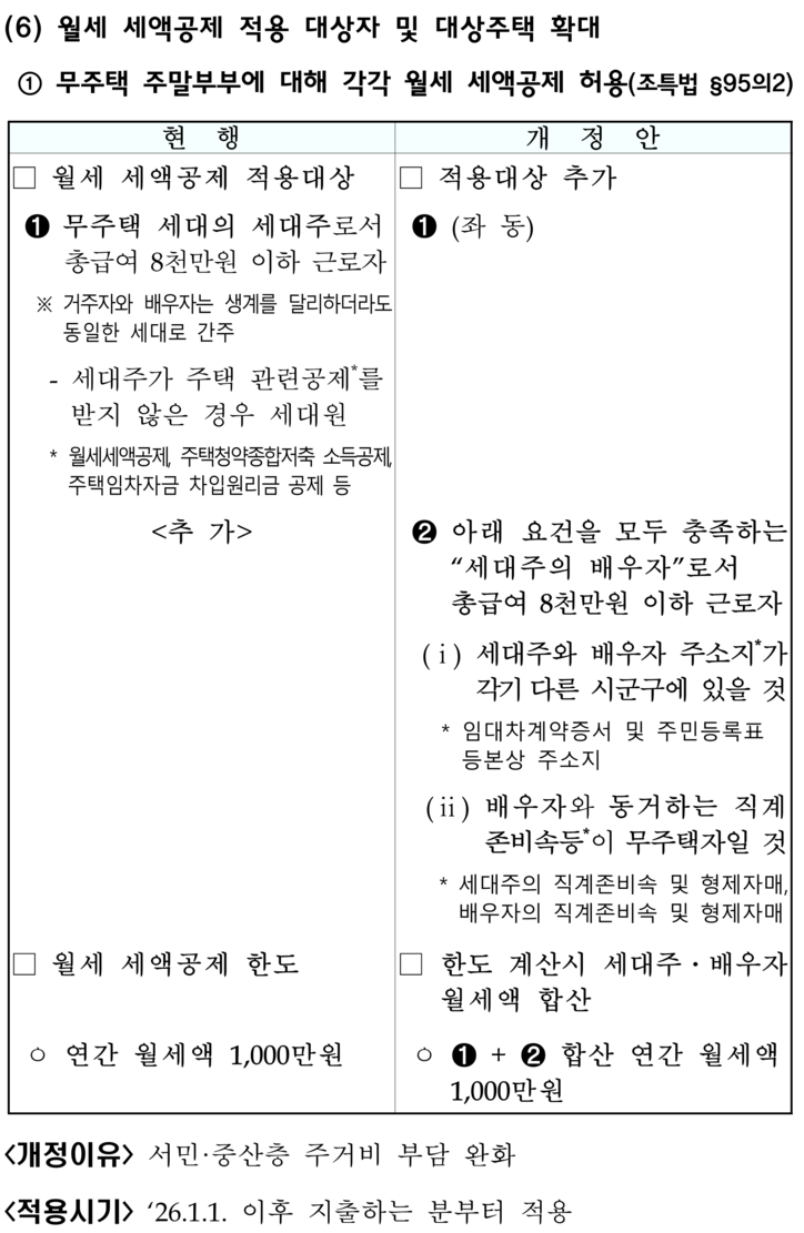 정부가 근무 목적 등으로 주거를 달리하는 부부에게 각각 월세 세액공제를 허용한다. 부부합산 한도는 연 1000만원이다.