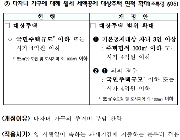 31일 기획재정부가 발표한 `25년 세제개편안에 따르면 근로자·성실사업자 등의 월세액에 대해 세액공제를 적용하며 주거를 달리하는 경우 부부에 대해서도 각각 적용하고, 3자녀 가구에 한해 월세세액공제 대상주택의 규모를 상향한다. 이에 따라 3자녀 이상인 경우에는 지역구분 없이 100제곱미터 이하의 주택은 월세 세액공제 혜택을 받을 수 있다.