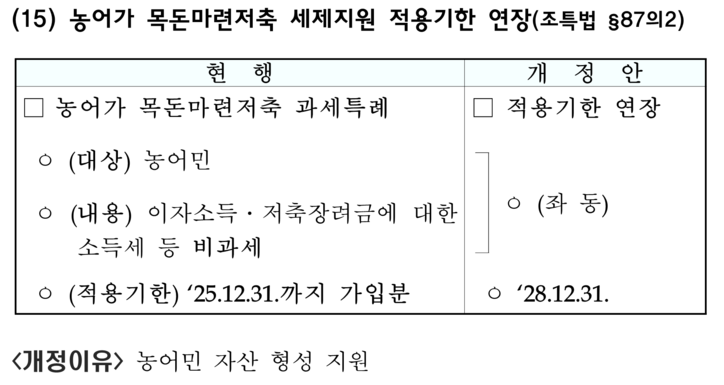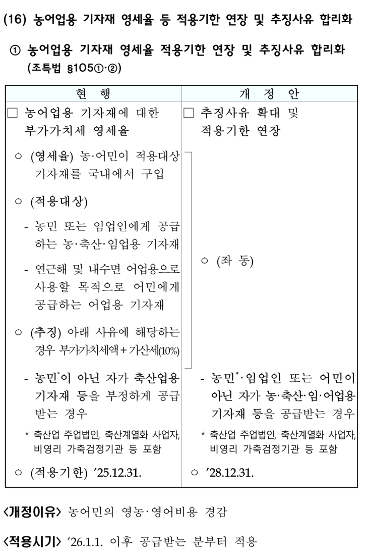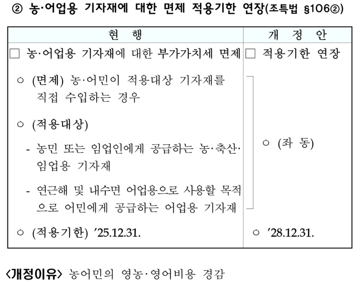 이 외에도 정부는 농어가 목돈마련저축의 이자소득·저축장려금에 대한 소득세 등 비과세 적용기한을 `28년 말까지 3년 연장하고, 농·임·어업용 기자재에 대한 부가가치세 영세율 및 면세 적용기한도 `28년 말까지 3년 연장한다.