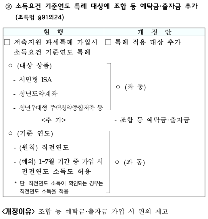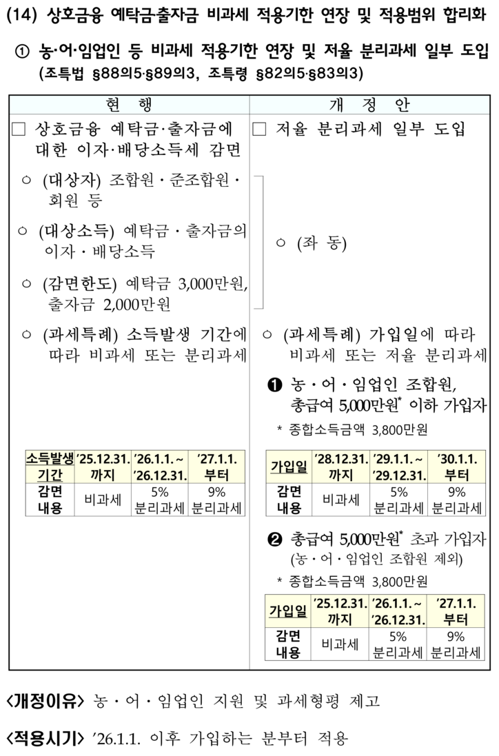 농협·수협·산림조합 조합원과 소득이 낮은 준조합원등에 대해 예탁금 등 이자·배당소득 비과세 적용기한을 `28년 말까지 3년 연장한다. 소득 기준은 서민형 ISA 가입조건과 동일한 총급여 5000만원(종합소득 3800만원)이다. 다만 농어민 외 소득이 높은 준조합원 등은 저율 분리과세(`26년 5%, `27년~ 9%) 적용된다.