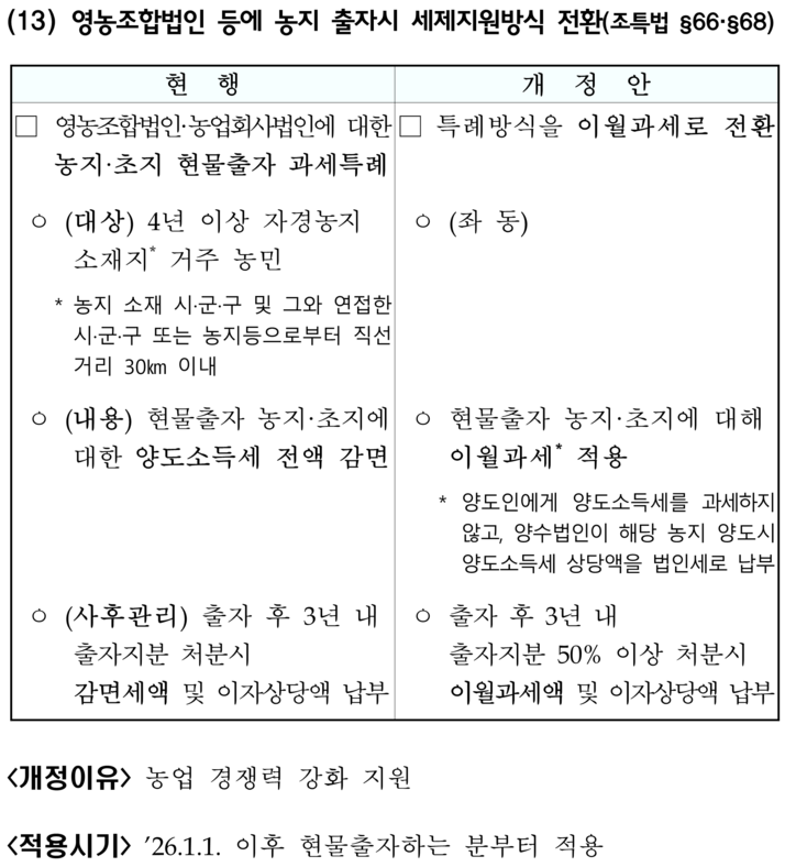 농업인이 영농조합법인·농업회사법인에 농지를 출자할 경우 양도소득세 지원방식을 세액감면에서 이월과세 방식으로 전환한다. 농업의 지속가능성을 위해 농업인이 농지를 양도·용도 변경하는 대신 농업법인에 출자할 수 있도록 유도하기 위함이다. 감면한도가 적용되지 않는 이월과세 방식으로 전환해 농지를 출자하는 농업인의 세부담이 없도록 지원한다는 방침이다.