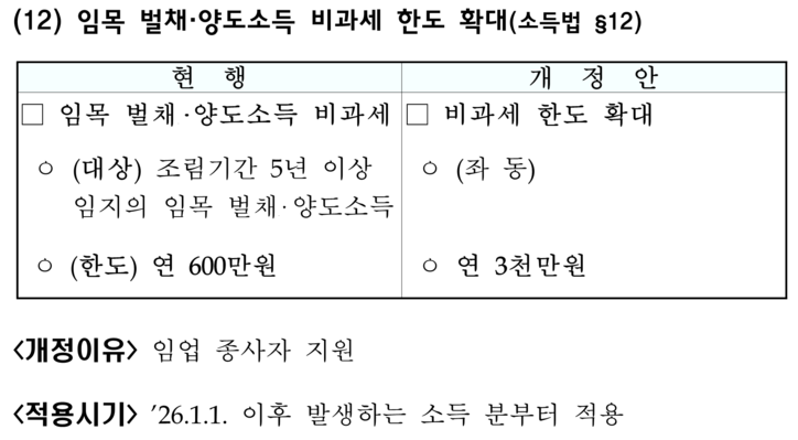 31일 기획재정부가 발표한 `25년 세제개편안에 따르면 현행 연 600만원까지 비과세 되는 임목 벌채·양도소득 비과세 한도를 3000만원으로 상향한다.