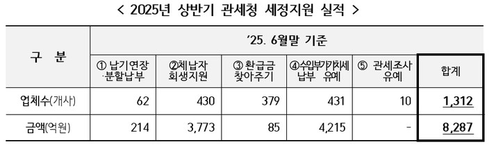 한편, 관세청은 올해 상반기 경영 위기에 처한 중소기업의 경영 정상화를 위해 5개 분야에서 약 1천 300여개 기업에 8300억원 규모의 세정 지원을 했다.