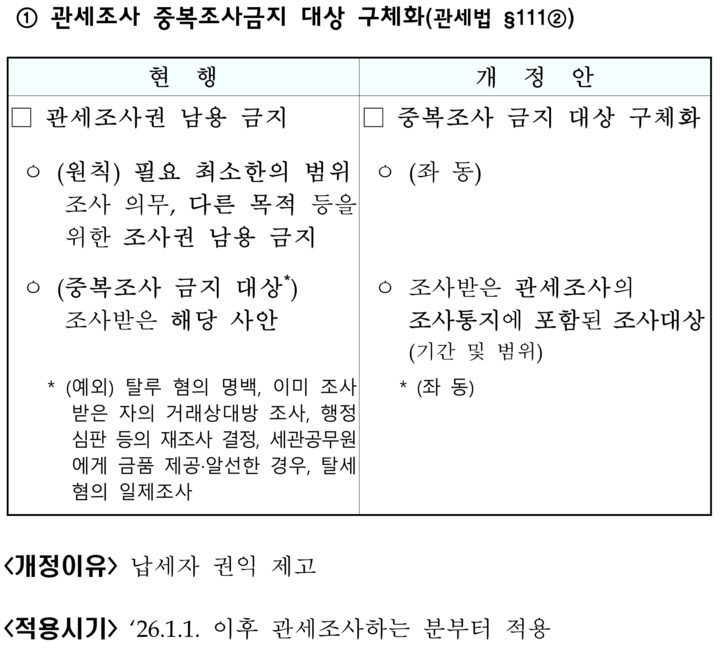 현행 관세조사권 남용 금지를 위해 중복조사 금지 대상에는 조사받은 해당 사안으로 규정돼 있다. 개정안은 조사받은 관세조사의 조사통지에 포함된 조사대상(기간 및 범위)으로 규정한다.