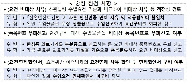 관세청은 사전 승인을 받아야 하는 건설·산업기계, 안전모·장갑 등 보호장비, 고압가스용기, 가전제품 등의 물품을 고의로 다른 품목으로 신고하거나 인증기관의 허가 없이 수입 여부 등 관련 법규 준수 실태를 중점 점검할 예정이다.