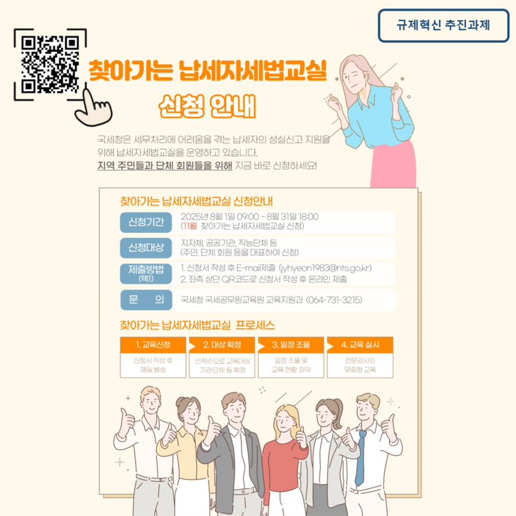 기간은 월 5회로 1회당 최소 30명 이상이며, 세법교실 신청을 희망하는 납세자는 신청서 작성 후 이메일을 제출하면 된다.