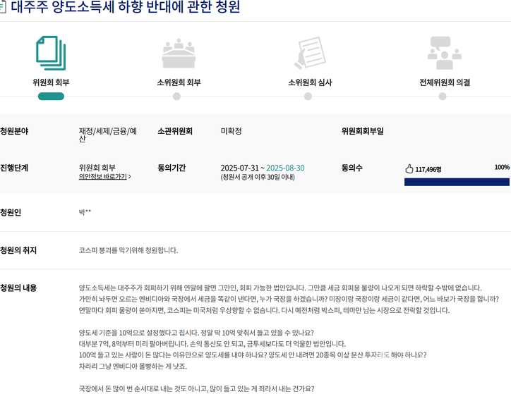 세제개편안 발표 직후 국회 국민동의 청원 게시판에는 '대주주 양도소득세 하향 반대에 관한 청원'이 올라왔다.