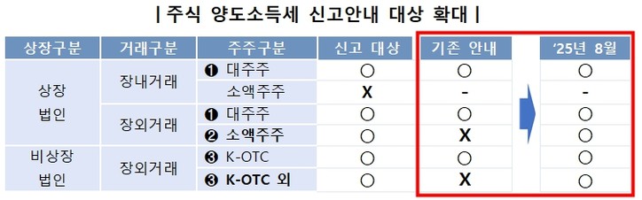 국세청은 이번 신고부터는 증권사로부터 계좌간 주식 이체자료를 조기 수집해 상장주식을 장외거래한 소액주주와 비상장법인 주주에게도 신고안내를 처음으로 실시할 계획이다.