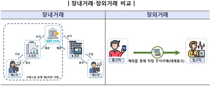 장외거래란, 한국거래소(KRX)가 개설한 증권시장(코스피·코스닥·코넥스)을 통하지 않은 모든 주식거래를 말하는 것으로 비상장주식 거래와 상장주식 거래라도 거래소 밖에서 이뤄지는 거래가 포함된다.
