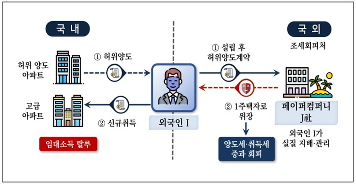 〇국내 거주 중인 외국인 I는 ‘다주택자에 대한 양도세, 취득세(지방세) 중과*’ 등을 피하기 위해 두 번째 주택을 구입하기 직전 조세회피처에 페이퍼컴퍼니 J社를 설립하고, 자신이 보유하던 아파트를 J社에 허위 양도