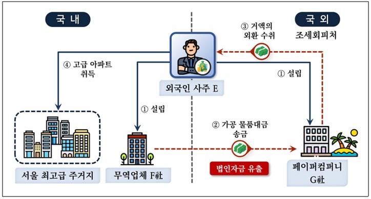 -E는 국내 법인 F社의 법인자금을 유출하기 위해 페이퍼컴퍼니 G社로부터 물품을 매입한 것으로 꾸미고 물품대금을 허위지급하여 법인세 탈루