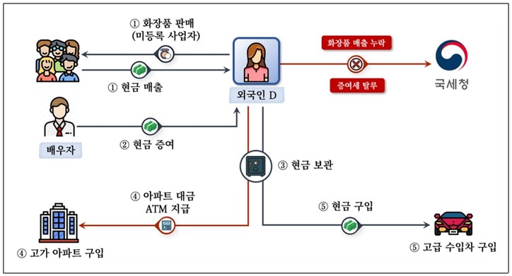 〇외국인 D는 ①국내에서 미등록 사업자로 수입 화장품 판매업을 운영, 지난 5년간 ○○억 원 현금 매출하며 얻은 소득을 무신고
