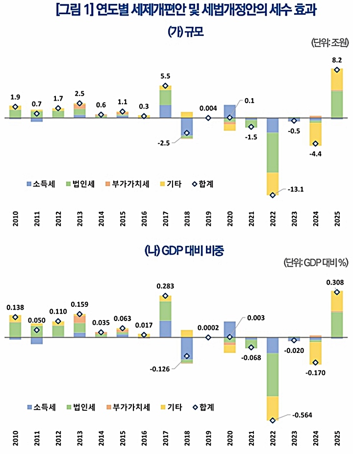 오종현 본부장은 “이번 개편안으로 연간 약 8조2000억원, GDP의 약 0.31% 세수를 추가 확보할 수 있을 것으로 전망된다”며 “윤 정부 첫 세제개편안은 연간 약 13조1000억원, GDP의 약 0.56% 세수 감소 효가를 발생시켜, 감세기조로 인한 세입기반 약화와 재정적자 확대, 또 향후 예상되는 재정지출 수요 증가를 고려하면 세수확대는 불가피하다”고 설명했다.