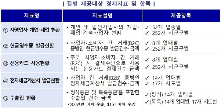 제공대상 경제지표는 △자영업자 개업·폐업 현황 △현금영수증 발급현황 △신용카드 사용현황 △전자세금계산서 발급현황 △수출입 현황 등 5개 지표로서 전월 현황을 다음 달 말일에 제공할 예정이다.
