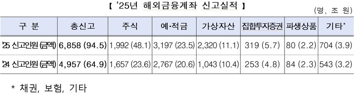 해외주식계좌는 올해 1992명, 48조1000억원이 신고돼 `24년 1657명, 23조6000억원보다 크게 증가했다. 전년과 비교하면 335명(20.2%), 24조5000억원(103.8%)이 늘었다. 특히 법인의 주식 신고금액이 23조1000억원 증가했다.