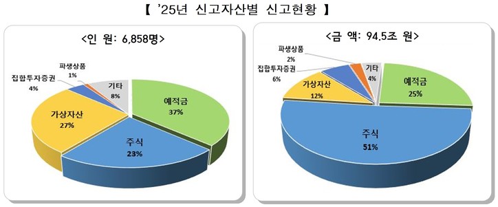 신고 자산별 분포는 신고인원 기준 예․적금 3197명, 가상자산 2320명, 주식 1992명 순이며, 신고금액 기준 주식 48조1000억원, 예・적금 23조5000억원, 가상자산 11조1000억원 순으로 나타났다.