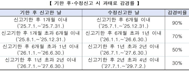 올해 신고기한인 `25년 6월30일 이후에도 미(과소)신고에 대해 수정·기한 후 신고한 자는 최대 90%까지 과태료 감경이 가능하다. 기한 후 신고 시 올해 12월31일까지는 70%, `26년 6월30일까지 50%, `27년 6월30일까지 30% 감경해 준다.