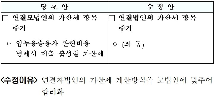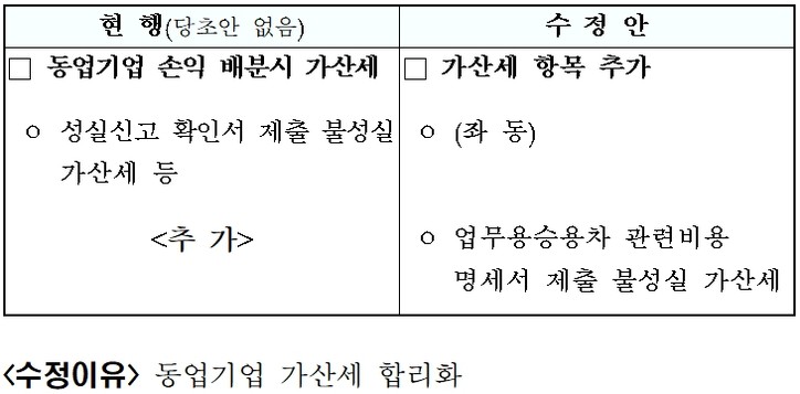 이 외에도 동업기업 손익 배분시 가산세 규정에 업무용승용차 관련비용 명세서 제출 불성실 가산세를 추가하고, 연결법인 가산세 규정도 함께 정비한다.