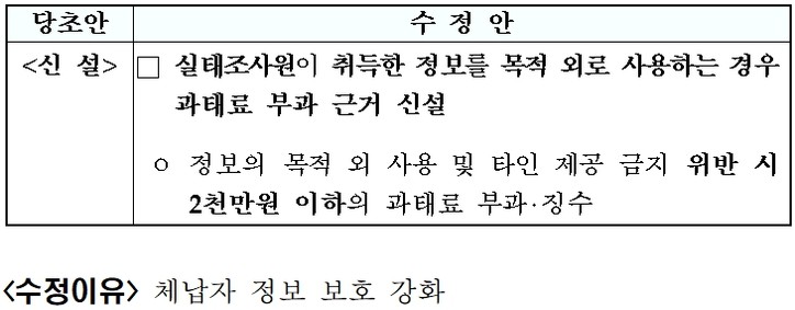 또한 체납자 정보 보호 강화를 위해 실태조사원이 취득한 정보를 목적 외로 사용하는 경우 과태료 부과 근거를 신설하고, 정보의 목적 외 사용 및 타인 제공 금지 위반 시 2000만원 이하의 과태료 부과 및 징수하는 내용이 담겼다.