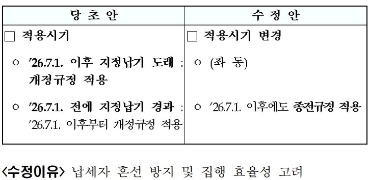 이번 세법개정안에서 수정된 내용으로는 지정납부기한 이후 납부지연가산세 산정방법을 일 단위에서 월 단위로 종전규정을 적용키로 했다.