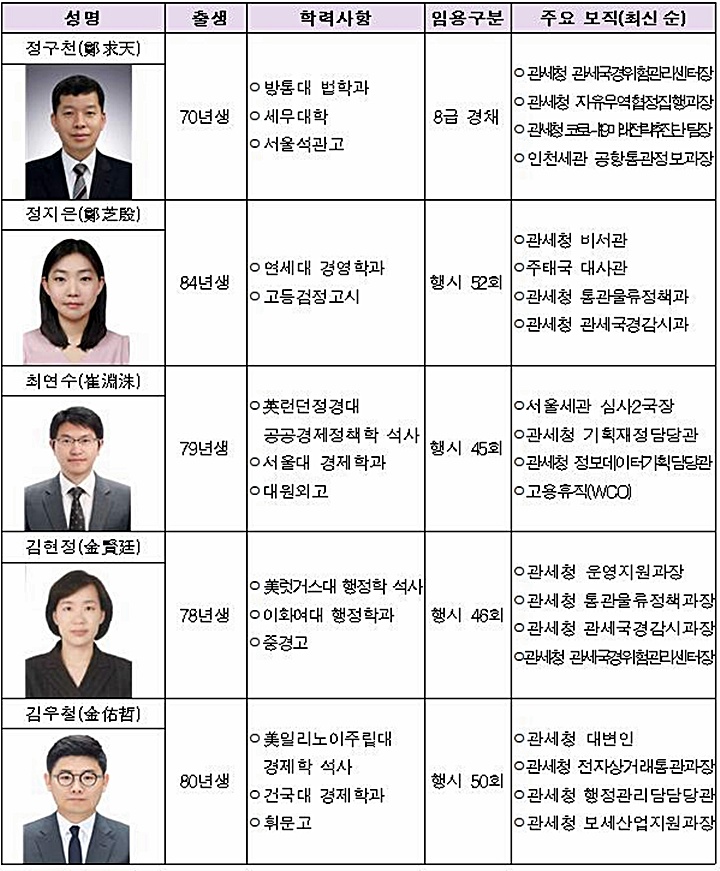관세청은 27일 정구천 대변인, 정지은 관세국경위험관리센터장, 최연수 운영지원과장 등 5명에 대한 과장급 전보인사를 8월 28일자로 단행했다.