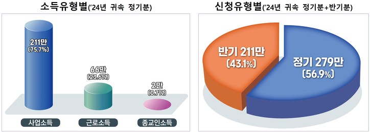 소득유형별로 보면 사업소득 가구(211만 가구, 75.7%)는 정기신청만 가능해 가장 큰 비중을 차지하며, 근로소득 가구(66만 가구, 23.6%)는 정기 또는 반기 신청을 선택할 수 있어 사업소득 가구에 비해 비중이 상대적으로 낮다.