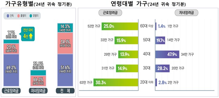 자녀장려금은 연령별로 보면 부양자녀가 많은 40대(34만 가구, 47.9%)가 가장 많고, 가구 유형별로는 맞벌이 가구에 비해 상대적으로 소득이 적은 홑벌이 가구(47만 가구, 66.2%)가 더 많았다.