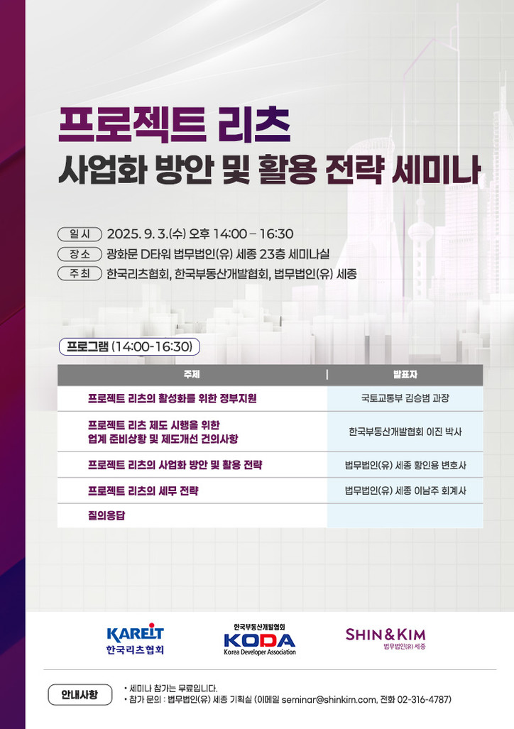 이어 리츠의 설립 및 운용, 자금 조달, 공모 및 상장, 세제 및 규제 대응 등 다수의 관련 업무를 수행해온 세종의 황인용 변호사(변시 5회)가 ‘프로젝트 리츠의 사업화 방안 및 활용 전략’에 대해 발표하며, 세종의 이남주 회계사는 프로젝트 리츠의 세무 전략 및 회계 이슈를 설명하는 등 프로젝트 리츠를 활용한 사업 전반에 적용되는 핵심 주제들이 심도 있게 다뤄질 예정이다.
