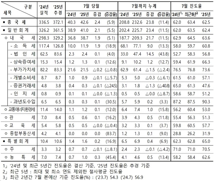 소득세도 증가했다. 소득세는 7월까지 77조1000억원이 걷히면서 전년보다 9조원이 증가했다. 성과급 지급이 늘고, 근로자수 증가에 따른 근로소득세가 증가했다. 해외주식 호조 등으로 양도소득세가 늘어난 것으로도 나타났다.