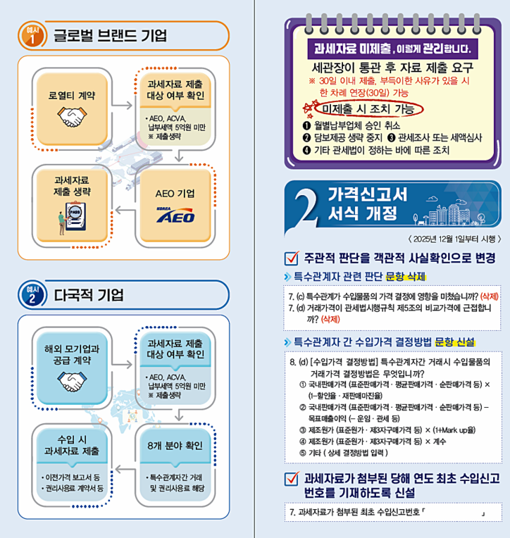 제출 자료는 ①권리사용료, ②생산지원, ③수수료, ④운임·보험료·기타운송관련비용, ⑤용기·포장비용, ⑥사후귀속이익, ⑦간접지급금액, ⑧특수관계자 거래 등 8개 주요 분야로 명확히 하고, 같은 조건으로 반복 거래하는 경우 매년 최초 1회만 제출하도록 규정해 기업 부담을 최소화했다. 통관 단계에서 과세자료 준비가 지연될 때는 30일 이내 지연제출도 허용된다.