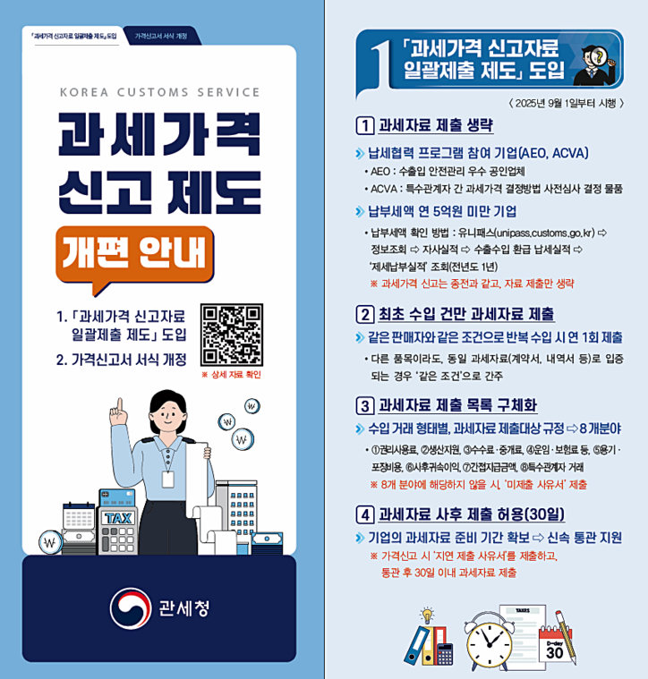 관세청은 필수 과세자료를 확보해 신고 오류를 조기에 확인·치유함과 동시에 납세자의 불필요한 과세자료 제출 부담을 경감하고자, ‘과세가격 신고자료 일괄제출 제도’를 9월 1일(월)부터 본격 시행한다고 밝혔다.