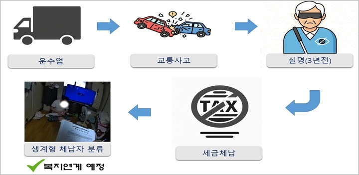 국세청에 따르면 대전광역시 외곽지역에 거주하고 있던 A씨는 소액 체납자로서 3년 전 사고로 두 눈을 실명한 뒤 경제생활을 하지 못하고 배우자와 어렵게 생활하고 있다.