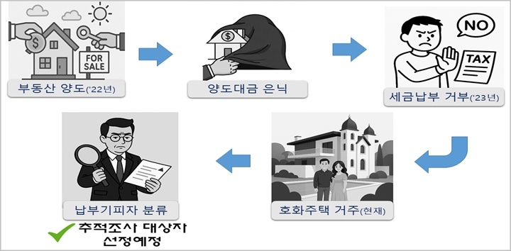 이 외에도 서울특별시에 거주하는 F씨는 고액의 양도세 등 수십억원을 체납한 뒤 시세 100억원을 초과하는 타인명의(전 처 추정) 초고가 주택에서 거주하고 있었다.