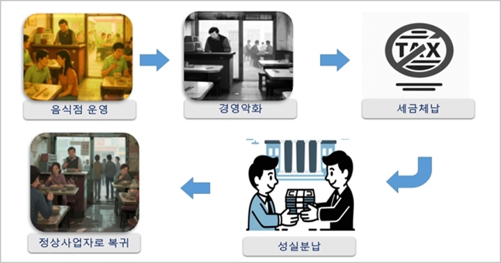 장기간 매출 감소와 금융기관 대출이자 부담 증가로 사업 위기가 발생했고, 체납액도 늘면서 관할 세무서에서 신용불량 통보와 신용카드 매출채권 압류, 공매예고 통지 등 강제징수를 실시했다.