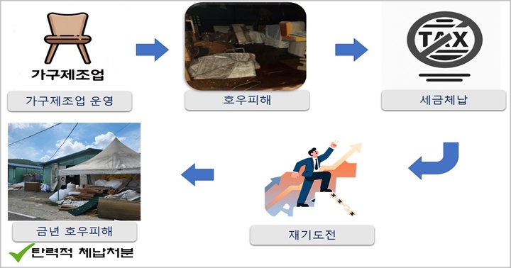 침대·소파 제조업을 영위하는 C씨는 지난 `22년 8월 수도권 일대에 집중호우가 발생해 기록적인 호우피해로 세금을 납부할 수 없을 정도로 큰 피해를 입어 고액의 체납이 발생했다. C씨는 재기를 위해 자택을 처분하고 사업장에서 숙식하며 10명의 직원과 재기를 위해 노력했으나 또다시 집중호우 피해를 입게 됐다.