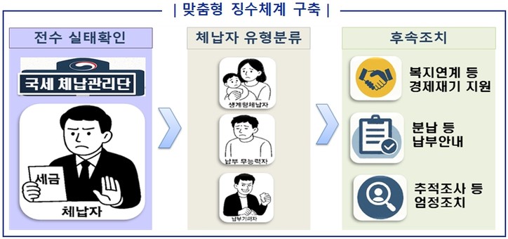 유형분류를 통해 △생계형 체납자는 복지부처와 연계하는 등 재기의 기회를 마련해주고 △고액‧상습 체납자는 현장 수색・민사소송 등 모든 수단을 총동원해 징수할 예정이다.