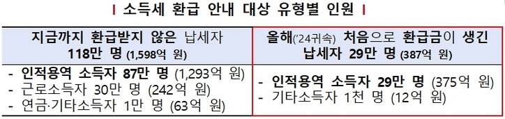 국세청이 올해 새로 환급금이 생긴 29만명을 더해 총 147만명의 인적용역소득자들에게 1985억원을 지급한다.