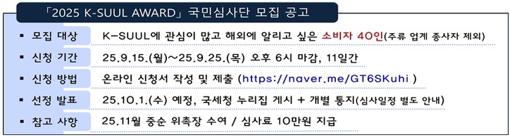 ‘2025 K-SUUL 심사위원회’는 국민이 직접 참여하는 국민심사단, 주류 전문가로 구성된 자문심사단, 수출 경험이 많은 대기업과 해외매장이 있는 대형유통사 등의 기업심사단 및 국세청 내부심사단으로 구성된다.