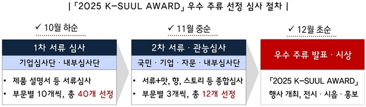 12월 개최하는 ‘2025 K-SUUL AWARD’ 행사에서 심사 결과 최종 선정된 우수 주류 12개 제품을 발표와 함께 시상하고, 수상한 모든 주류의 전시・시음을 통해 각 주류의 고유한 맛과 향, 우수성 및 성장 가능성 등을 홍보할 예정이다.
