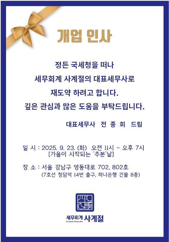 전종희 대표세무사는 “정든 국세청을 떠나 세무회계 사계절의 대표세무사로 재도약하려고 한다”며 “깊은 관심과 많은 도움 부탁드린다”고 전했다.
