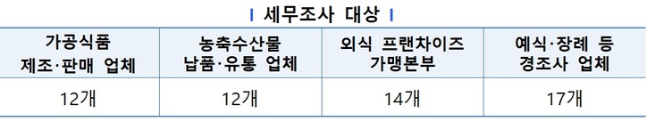 국세청은 이처럼 원자재 가격 상승을 핑계 삼아 변칙적 방법으로 원가를 부풀려 소득을 축소하면서도 과도하게 가격을 올리는 생활물가 밀접 업종 탈세자에 대해 강도 높은 세무조사를 실시한다. 이번 세무조사 대상은 가공식품 제조・판매 업체 12개, 농축수산물 납품・유통 업체 12개, 외식 프랜차이즈 가맹본부 14개, 예식・장례 등 경조사 업체 17개, 총 55개 업체다.