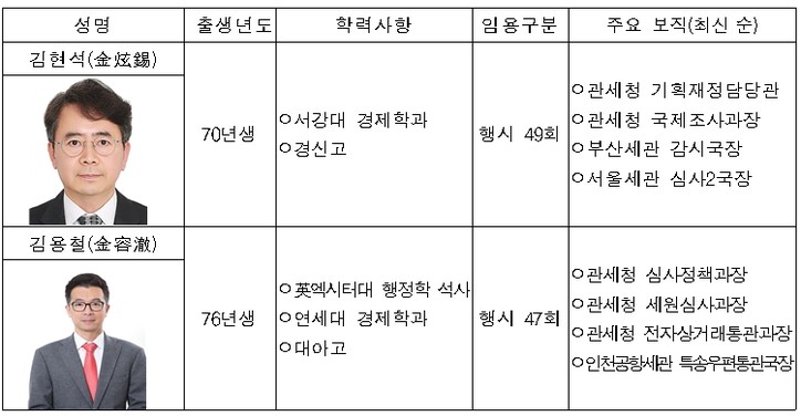 관세청은 `25년 25일자로 부이사관 승진인사를 단행했다. 부이사관 승진자는 김현석 과세청 기획재정담당관, 김용철 심사정책과장이며 관세청은 후속 고위직 인사를 실시할 예정이다.