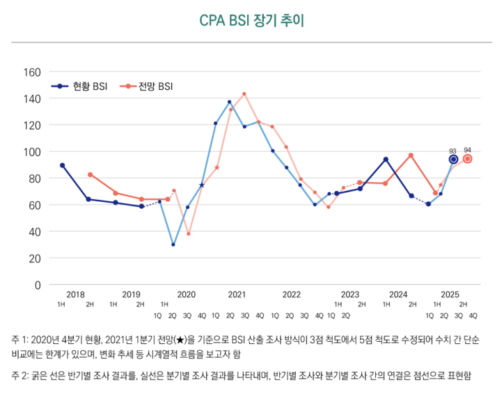 현황 BSI(93)는 올해 2분기(67) 대비 대폭 상승한 것으로 나타났다. 이는 올해 2분기 GDP 성장률 반등, 소비회복, 주식시장 회복세, 반도체 중심의 수출 증가, 물가안정 등에 기반하여 체감경기를 긍정적으로 평가한 것으로 보인다. 또 새 정부 출범에 따라 대내외 불확실성 완화와 정책 안정성에 대한 기대감이 영향을 미친 것으로 나타났다.