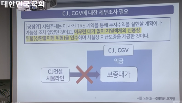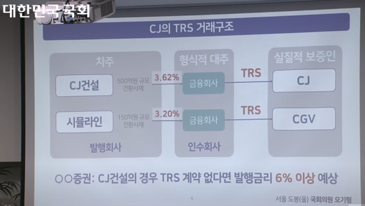 오 의원은 “결과적으로 일반적인 보증이 없었다면 발행금리가 6% 정도 되어야 되는데 3.6, 3.2 정도로 그 차액 상당의 이득이 CJ나 CGV로 넘어가는 효과가 있는 것”이라고 설명했다.