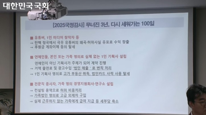 정 의원은 “실제 연예인들이 본인 또는 가족 명의로 1인 기획사를 세워 출연료와 광고 수입을 법인 매출로 처리하는 사례가 많다”며 “이 과정에서 법인 명의 고가 부동산 취득, 법인카드 사적 사용 등 탈세 정황도 적발되고 있다”고 설명했다.