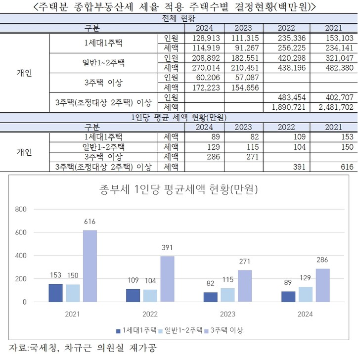 반면 다주택자의 평균 종부세는 `21년 문재인 정부 당시 3주택 이상 기준 616만원에서 지난해 286만원으로 절반 이상 줄었다. 이는 세율 완화와 공정시장가액비율 조정이 누적되며 전체 세 부담이 낮아진 결과로 풀이된다.