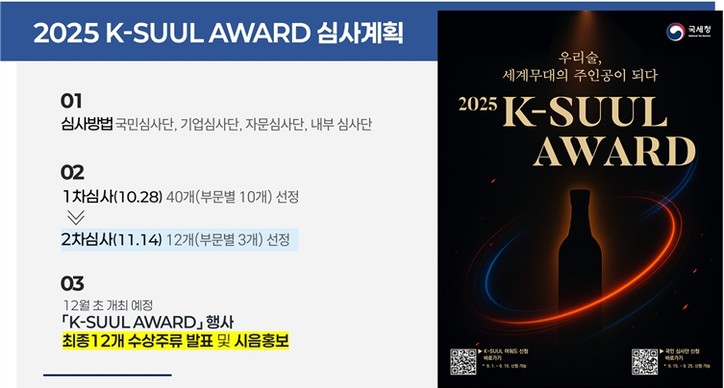 2025 K-SUUL AWARD는 올해 12월 최초로 개최되는 것으로, 국민이 직접 참여하는 국민심사단과 주류 전문가로 구성된 자문심사단, 대기업·대형유통사, 국세청 내부심사단 등이 심사에 참여해 4개 부문별 최종 우수 주류를 선정한다. 최종 선정된 총 12개 제품은 시상과 함께 국세청 인증 마크를 부착, 대형유통사와 협업을 통한 해외 현지 매장 판매를 우선 지원받는다.