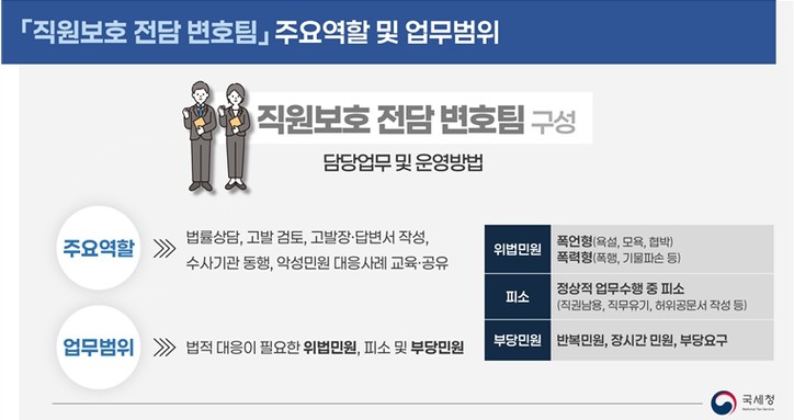 직원보호 전담 변호팀은 법률상담, 고발 검토, 고발장·답변서 작성 등의 업무부터 수사기관에 동행하고, 악성민원 대응사례를 교육·공유하는 역할을 담당할 예정이다.