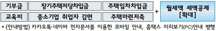 올해는 무주택 근로자를 위한 월세액 세액공제 제도 안내를 전년 대비 80% 확대(15만명)했으며 연말정산 내역 및 학자금 상환이력 등 내·외부 자료를 폭넓게 분석해 연말정산 때 문의가 많은 7가지 공제・감면 항목에 대해 안내한다.