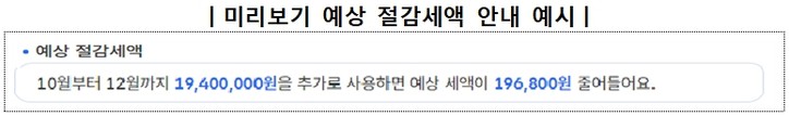 ○ ’25년 1월∼9월간 실제 신용카드 등 사용금액을 확인하고 10월 이후 지출 예상 금액을 입력하면 신용카드 소득공제에 따라 절감 가능한 세액을 미리 계산해볼 수 있습니다.